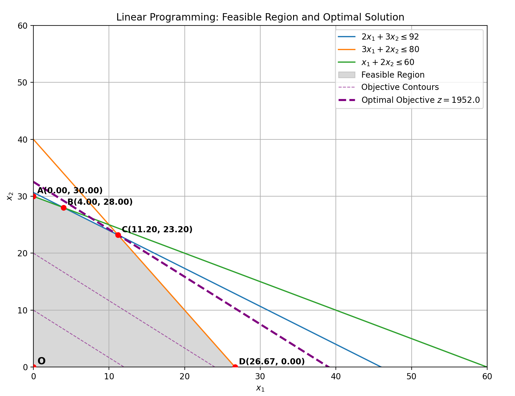 - D(33.33,0):约束1与横轴的交点