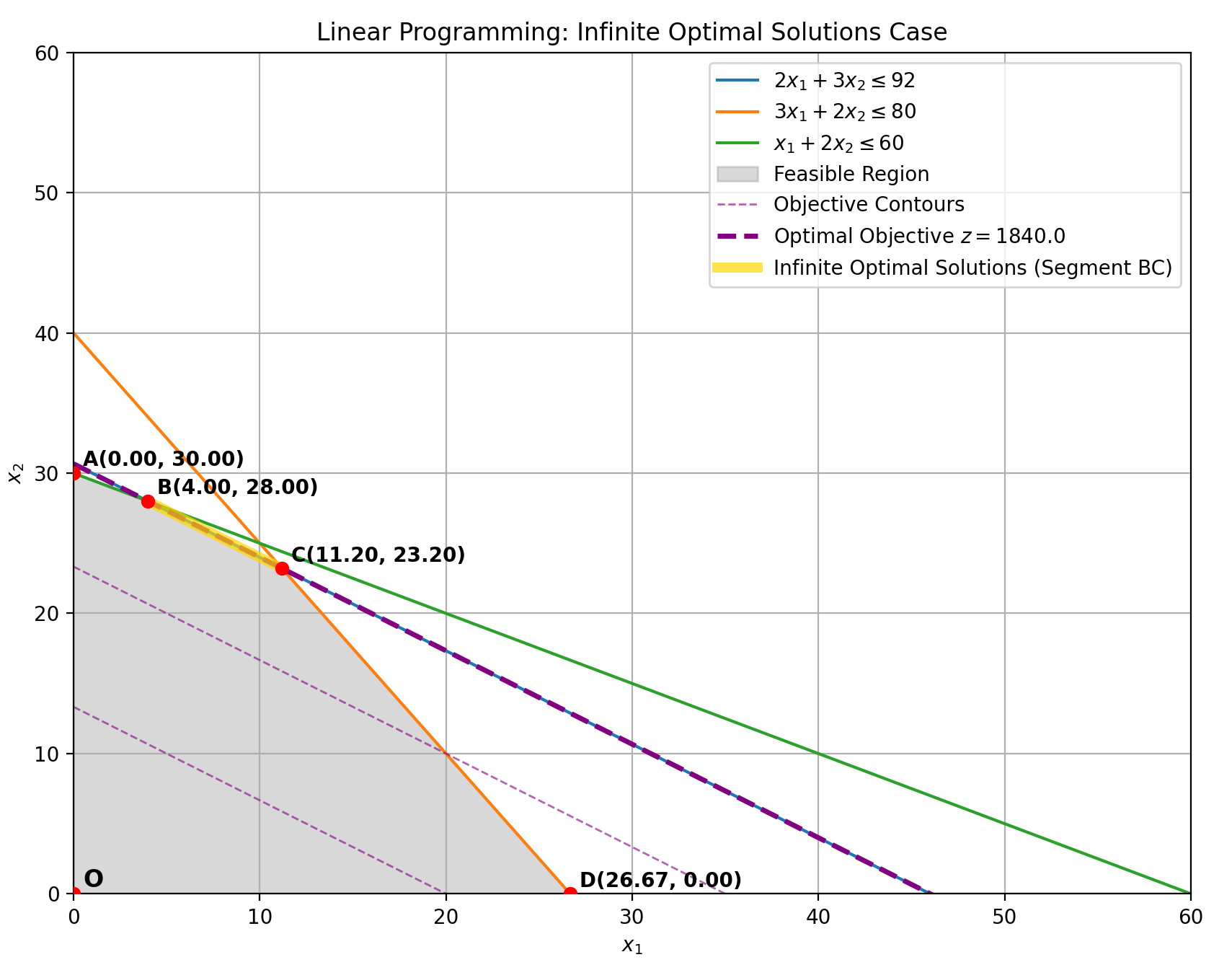 - 约束1:$2x_1 + 3x_2 \leq 92$