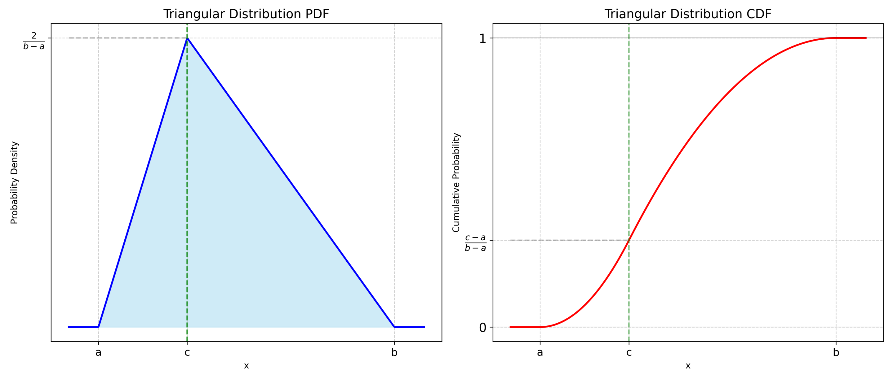 三角分布是工程仿真、项目管理(如 PERT 图)及风险评估中极为常用的连续概率分布。它由三个易于估算的参数定义:最小值 ($a$)、最大值 ($b$)和众数/最可能值 ($c$)(满足 $a \le c \le b$)。其概率密度函数图像呈三角形:从 $a$ 上升至 $c$ 达到峰值,随后下降至 $b$。