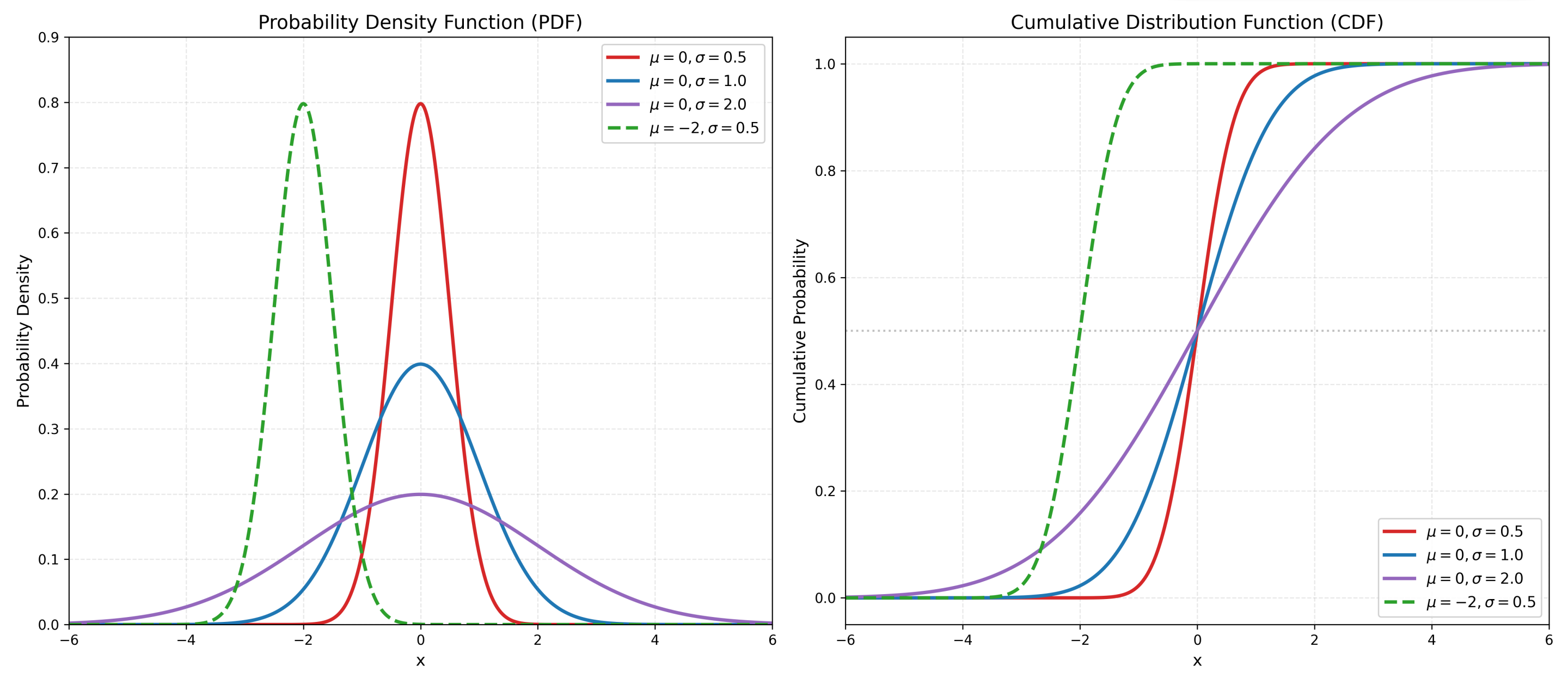 - 均值 ($\mu $):决定了分布曲线的中心位置。