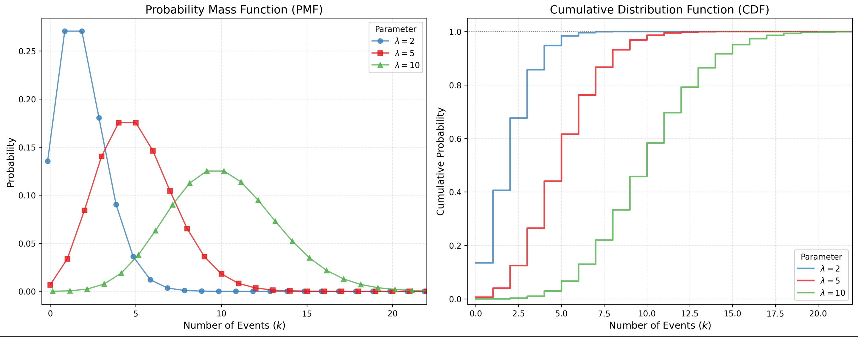 $$P(X=k) = \frac{e^{-\lambda} \lambda^k}{k!}, \quad k=0,1,2,\dots$$