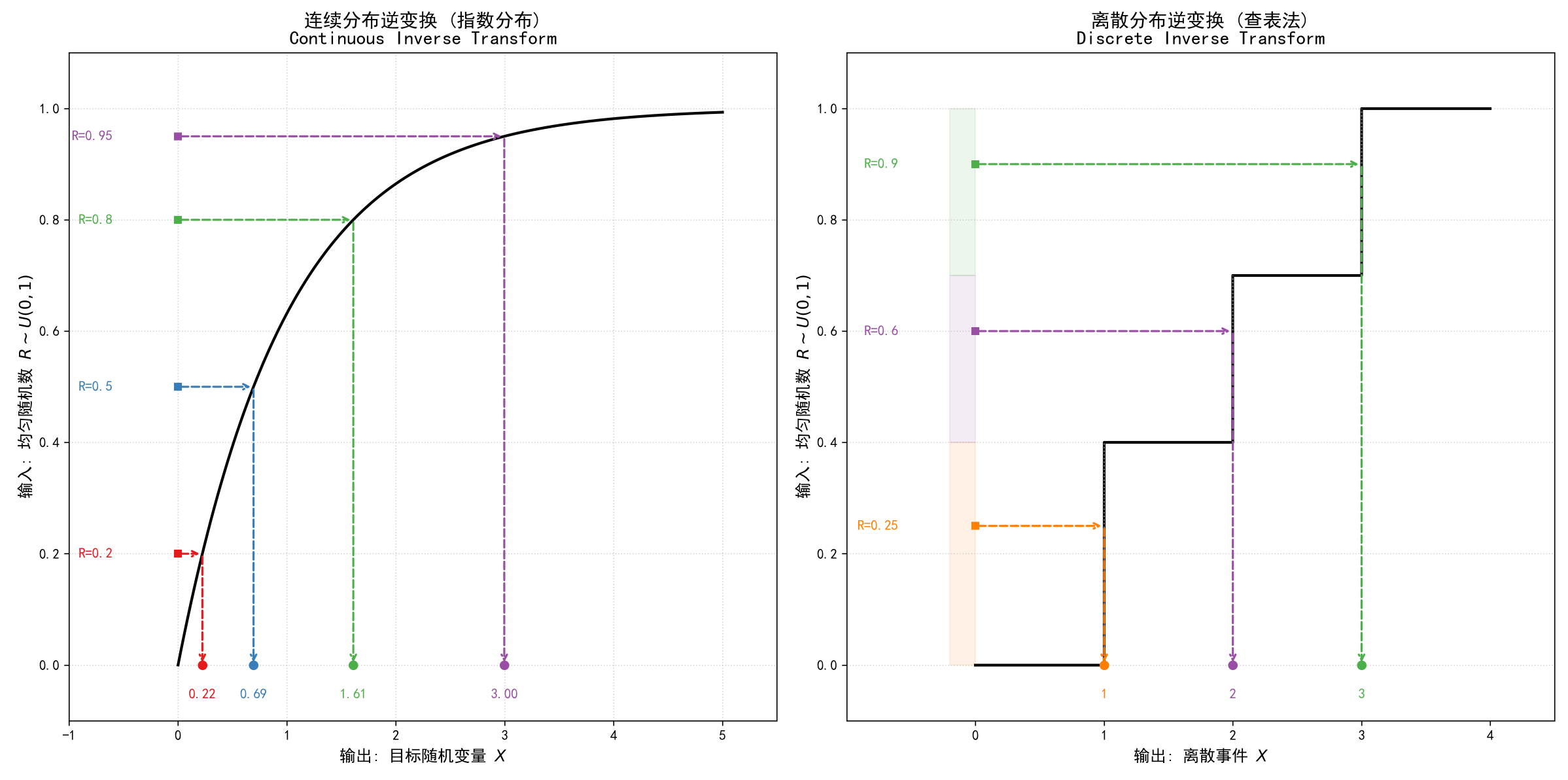 - 保持相关性:这是高级仿真最重要的特性。逆变换法能保持方差缩减技术(如公共随机数法)的有效性。简单说,如果两个系统用同一个 $R$ 生成随机数,用逆变换法可以保证 $X_1$ 和 $X_2$ 是正相关的($R$ 大,$X_1, X_2$ 都会大),这对比较两个系统的优劣至关重要。