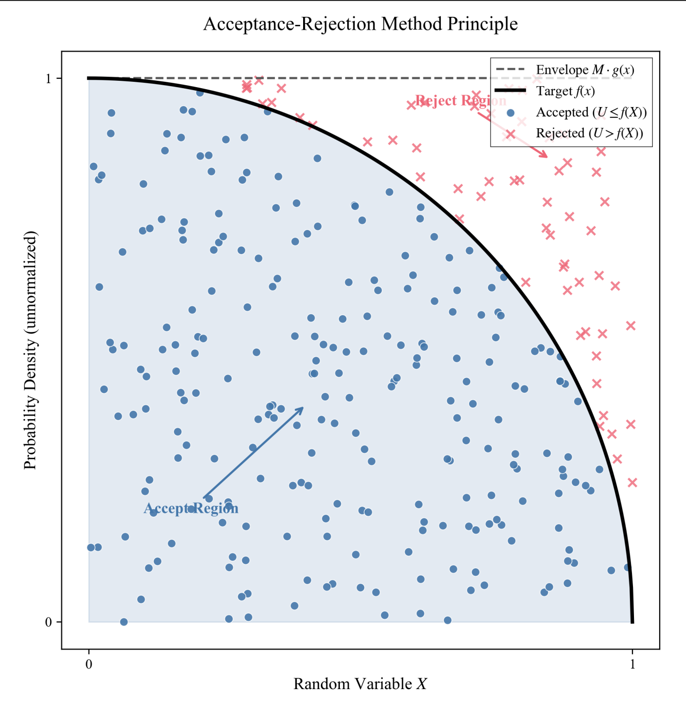 如果 $M$ 很大(包络函数 $M \cdot g(x)$ 和目标函数 $f(x)$ 之间空隙太大),我们会浪费大量的计算资源在“生成-拒绝-重来”的循环上,因此,选择一个贴合的辅助分布 $g(x)$ 和最小的常数 $M$ 是算法设计的核心。
